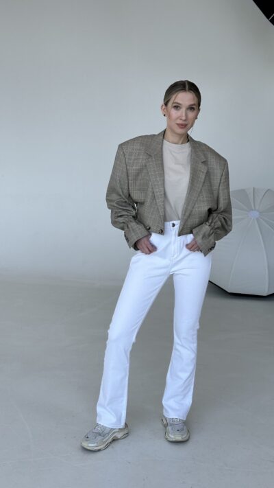 Przerobiona marynarka z drugiego obiegu została przekształcona w model o kobiecym stylu, podkreślająca talie (regulacja gumami). Ten trend odnawialnej mody jest coraz bardziej popularny, promując zrównoważoną konsumpcję i tworzenie unikatowych stylizacji z wykorzystaniem istniejących ubrań.